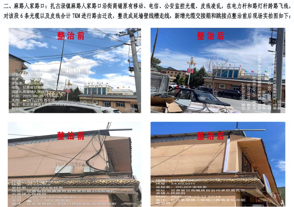 坚持目标导向与问题导向相结合,将杆线整治作为优化城乡面貌、保障民生安全、提升县域形象的关键抓手,按照“规划先行、点面结合、突出重点、分步实施”的思路,高站位谋划、系统性推进,积极对接州工信局,联合州县电力、移动、电信等单位共同参与整治工作,按照产权归属,制定细化辖区分段、分片治理方案,明确治理内容、治理步骤、治理责任。聚焦扎古录镇重点区域、合作至卓尼二级公路沿线、城区周边出租房密集区等,组织相关部门先后开展了多次摸排,严格遵循“整齐、美观、安全”的标准和“能入地则入地、应捆绑尽捆绑、宜贴墙则贴墙”的整治原则,灵活采取一杆多线、分类捆扎、套管保护、废旧清除等多种方式,进行精细化、精准化整治,合理开发利用和保护地下、地上空间资源。
