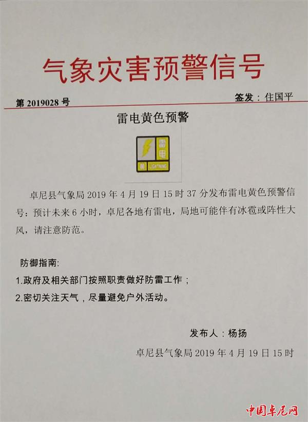 气象灾害预警信号(第2019028号)