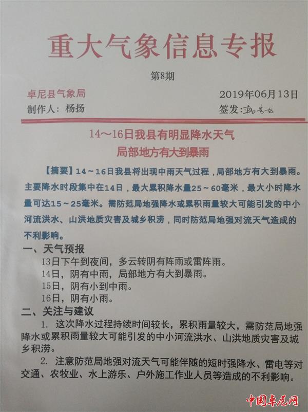 重大气象信息专报(2019年第8期)