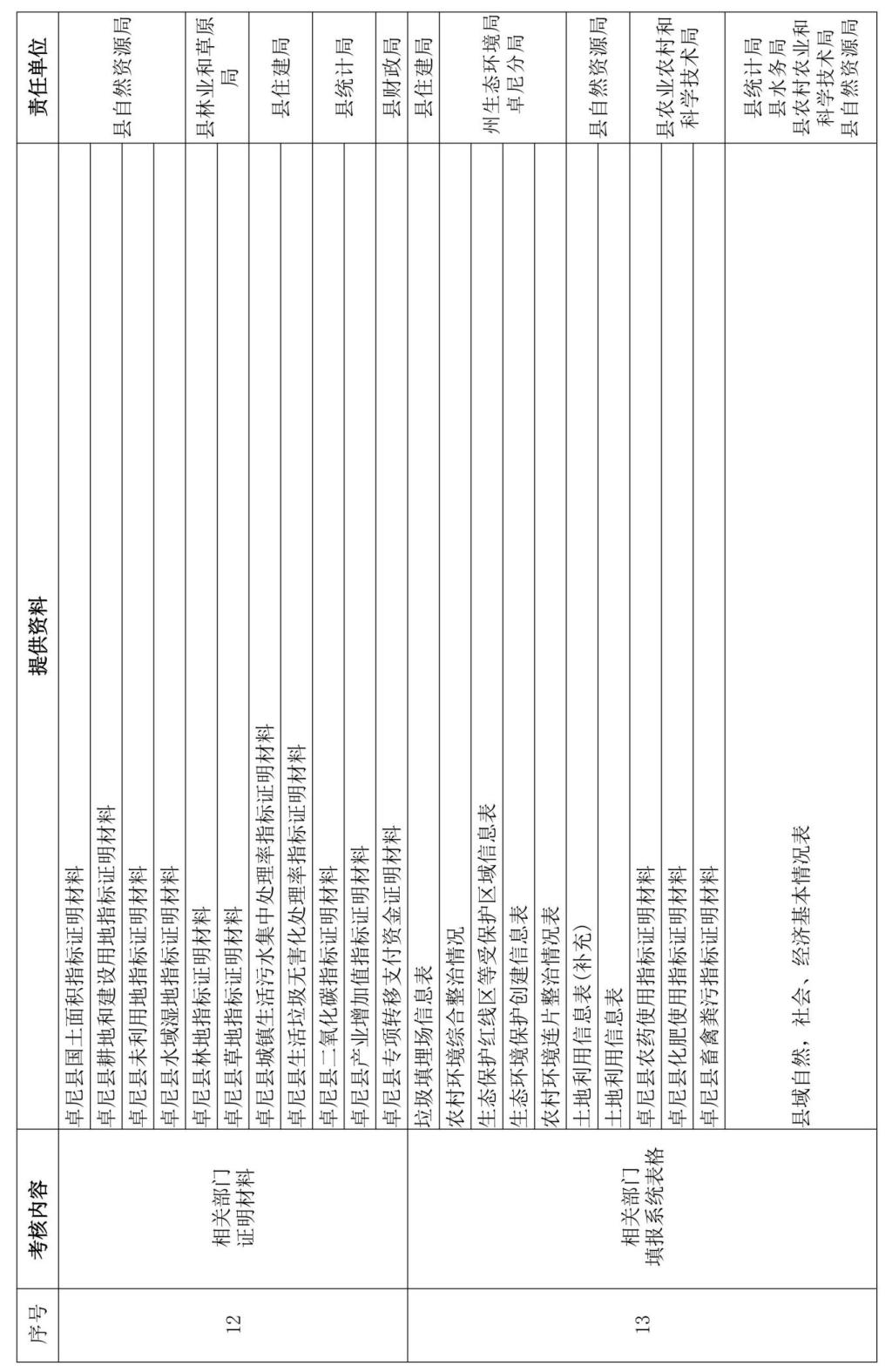 各乡镇人民政府,县政府有关部门,省州驻卓相关单位: 《2025年甘肃省卓尼县国家重点生态功能区县域生态环境质量监测评价和考核工作实施方案》已经县政府同意,现印发给你们,请认真组织实施。 卓尼县人民政府办公室 2025年10月10日 2025年甘肃省卓尼县国家重点生态功能区 县域生态环境质量监测评价和 考核工作实施方案 为全面完成我县国家重点生态功能区县域生态环境质量监测评价和考核工作,进一步加强我县国家重点生态功能区转移支付资金管理,推动《全国主体功能区规划》实施,维护国家生态安全,促进社会和谐发展,确保资金发挥效益,现结合我县实际,制定本实施方案。 一、指导思想 全面贯彻落实党的二十大、二十届历次全会精神和习近平总书记重要讲话重要指示批示精神,紧紧围绕统筹推进“五位一体”总体布局和协调推进“四个全面”战略布局,提高政治站位,增强“四个意识”,进一步强化重点生态功能区县域生态环境质量监测评价和考核工作的组织保障,切实增强转移支付对重点生态功能区生态环境保护的促进作用,提升重点生态功能区县域生态环境质量和管理水平,努力改善我县生态环境质量和人居条件。 二、职责分工 县政府办公室:负责提供县委县政府成立的县域考核协调机构文件;提供由县委县政府颁发的考核年内生态环境保护的政策和制度;负责统筹协调我县生态环境质量考核各项具体工作,审核生态环境质量考核自查报告和相关数据资料。 州生态环境局卓尼分局:会同县政府办公室按照中央、省、州下发的考核文件要求,统筹负责组织实施考核年县域生态环境质量监测评价和考核自查工作;制定卓尼县国家重点生态功能区县域生态环境质量监测评价和考核工作实施方案;明确各部门职责分工,督导相关单位按要求填报相关数据;按要求及时完成卓尼县水质、空气质量及重点污染源的监测工作;按规定在国家重点生态功能区县域生态环境质量考核系统录入相关数据信息并规范编制年度《国家重点生态功能区县城生态环境质量考核自查报告》,报送省环境监测中心站。 县财政局:负责审核和监督生态功能区转移支付资金使用情况,引导我县加大生态环境保护和监管能力建设资金投入;提供经县人大审议通过的当年财政支出预算;(未列入地方预算的专项转移支付资金也需要统计在内)。提供转移支付资金涉及的所有项目资料,(包括实施方案、长效机制、资金拨付、资金审计、项目管理)。 县发改局:负责制定并正式公布我县的重点生态功能区产业准入负面清单,并提供当年产业准入负面清单考核资料等相关证明材料。负责提供生态文明小康村建设项目立项文件、已完成生态文明小康村建设的行政村占县域内所有行政村的比例相关文件资料。 县农业农村和科学技术局:负责提供农药、化肥使用指标证明和农业面源污染防治相关证明材料。 县自然资源局:负责提供国土面积、耕地和建设用地、未利用地、水域湿地、土地利用信息、荒漠化面积、荒漠化治理面积等相关证明材料。 县林业和草原局:负责提供县域草地、林地指标等相关证明材料。 县统计局:负责提供产业增加值指标、二氧化碳指标证明材料和县域自然、社会、经济基本情况等证明材料。 县住建局:负责提供城镇生活污水集中处理率、城镇生活垃圾无害化处理率、城区污水管网设施建设、生活垃圾填埋设施建设以及运行情况;乡镇垃圾、污水收集等相关证明材料。 县水务局:负责提供万元 GDP 耗水量、水域湿地面积、水土流失面积、水土流失治理面积等数据证明材料。 甘肃洮河国家级自然保护区管护中心:负责提供国务院批准设立国家级自然保护区的公告文件以及保护区概况等资料、自然保护区名录、考核年省政府批准设立省级自然保护区的公告文件及保护区概况。其他生态创建情况(包括:国家森林公园、国家湿地公园、国家级风景名胜区、国家生态文明示范县),以国家相关部门的正式公告文件为准。 生态转移支付资金项目涉及单位:负责提供转移支付资金涉及的项目资料,包括项目立项合同、竣工验收文件、项目实施照片(电子版)等相关资料。 三、工作要求 (一)高度重视考核工作,确保考核工作按期完成。考核工作时间紧、任务重、涉及部门多、专业性强,各相关部门单位要高度重视,安排专人负责,加强协调沟通、紧密配合协作,做好相关资料收集工作,于10月31日前将各类资料上报县2025年国家重点生态功能区县域生态环境质量监测评价和考核工作专班办公室(州生态环境局卓尼分局)。 (二)认真做好资料收集,确保考核工作质量。县域生态环境质量监测评价和考核数据资料将通过国家重点生态功能区县域生态环境质量数据填报软件完成,所需数据填报及资料上传完成后,软件自动生成自查报告。各相关部门要认真做好指标计算、数据资料收集、审核等工作,确保数据资料全面、完整和准确,如实反映我县生态环境实际情况。 (三)切实保障工作经费,确保考核顺利完成。县财政局要根据年初预算和县国家重点生态功能区县域生态环境质量监测评价和考核工作计划,足额保障国家重点生态功能区县域生态环境监测经费。 附件:1.卓尼县2025年国家重点生态功能区县域生态环境质量考核自查工作专班 2.卓尼县2025年国家重点生态功能区县域生态环境质量