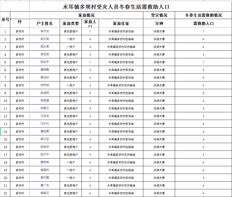 木耳镇多坝村冬春生活救助花名册